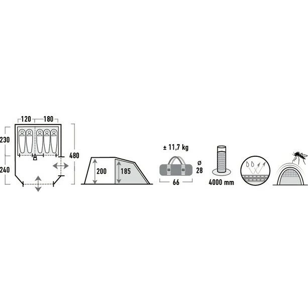 Inside zippered flap easy to adjust and packs neat into the easy stow away pocket. Two permanent top mesh panels for more ventilation. Versatile inner tent can used as one large cabin or by zipped divider into two cabins. Inner pockets and lamp holder complete the inner tent. Great family tent for shorter stay and weekend camper seeking lots of space. Delivered with compression packsack.