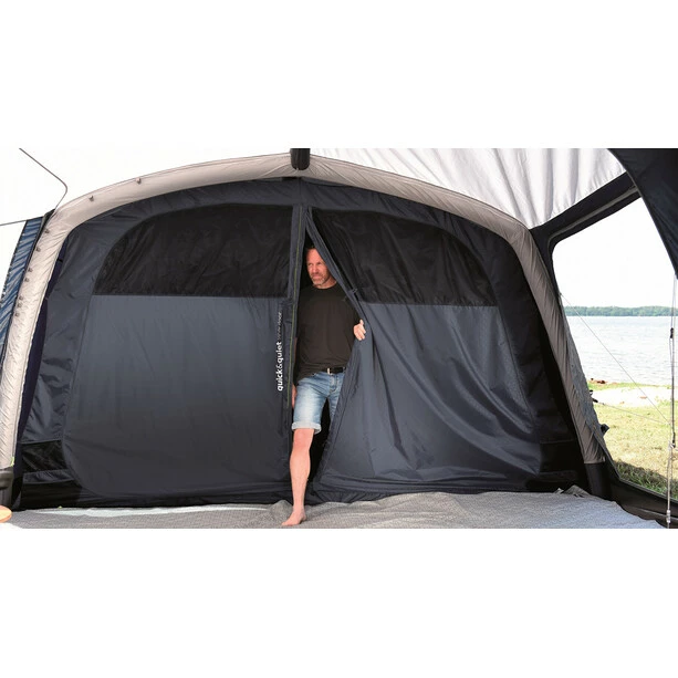 The flowing profile of the Hayward Lake 6ATC sleeps six in two Ambassador Master Bedrooms with Dark Inners and Outwell Quick & Quiet Inner Doors, has twin side doors plus the Rear Ventilation System to regulate airflow. Pre-shaped, Gothic-style air tubes ensure stability plus ample headroom with its steep sides maximising internal space over the durable polyethylene groundsheet. A deep canopy over the Outwell Easy Access Front Door system, with Quick & Quiet Access, offers shelter from downpours.