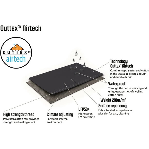 Outtex AirTech is a quality polycotton treated with a water repellent finish to help rain bead and roll off. It has a high resistance to water entry due to the dense weave and swelling of natural fibres when wet.