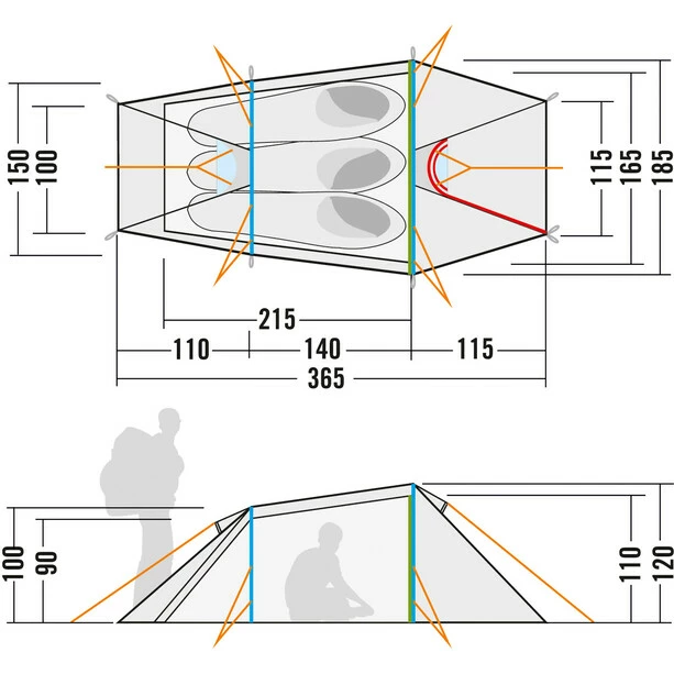 - Tunnel tent with two pole arches, the rear pole is shortened