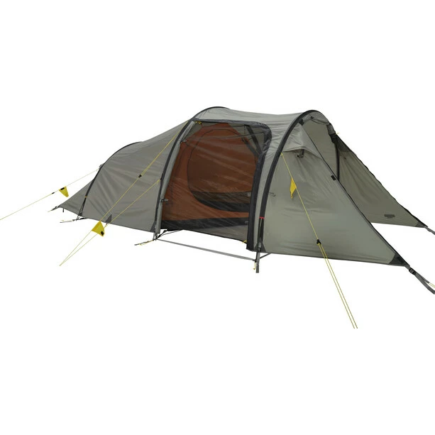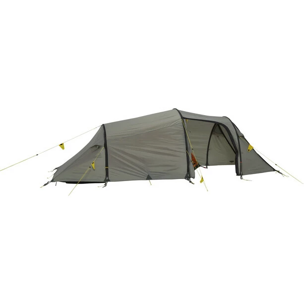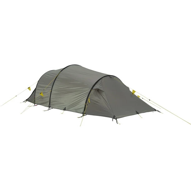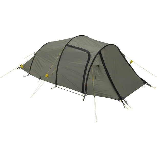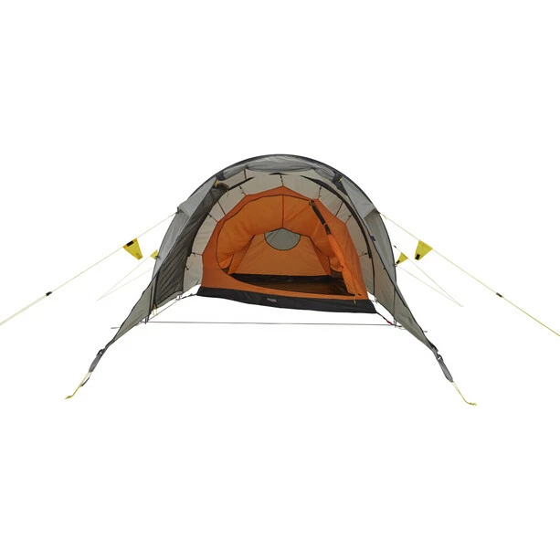 Unique in its kind: One of the most successful models and part of the collection from the beginning. Very spacious tent for persons. The unique inner tent design offers comfortable sleeping space for tall persons, too. It offers the advantages of an asymmetrical tunnel, such as a relatively small weight and great wind resistance with a large vestibule and spacious inner tent. The entrance to the inner tent is protected from the rain with a D-shaped door and a large vestibule with two entrances. The tent has outside pole sleeves that are easy to use. The inner tent has plenty of space for two persons and has back ventilation and numerous pockets. The side and front entrances make it easy to store your gear. When the front entrance is rolled up, an excellent panorama view is possible from the tent.